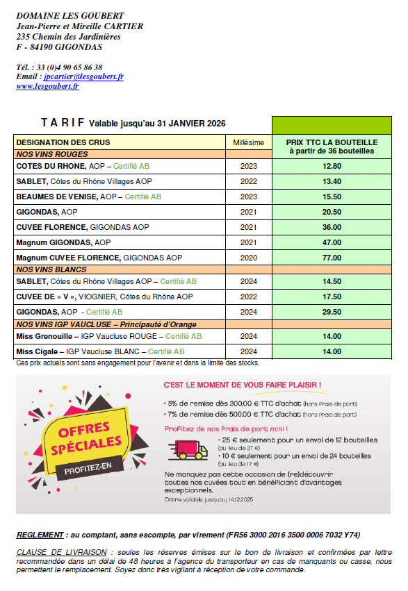 Suite au mailing annuel que vous avez récemment reçu, nous avons le plaisir de vous confirmer que la nouvelle grille tarifaire de nos cuvées est désormais en vigueur et valable jusqu’à la fin de l’année 2025.